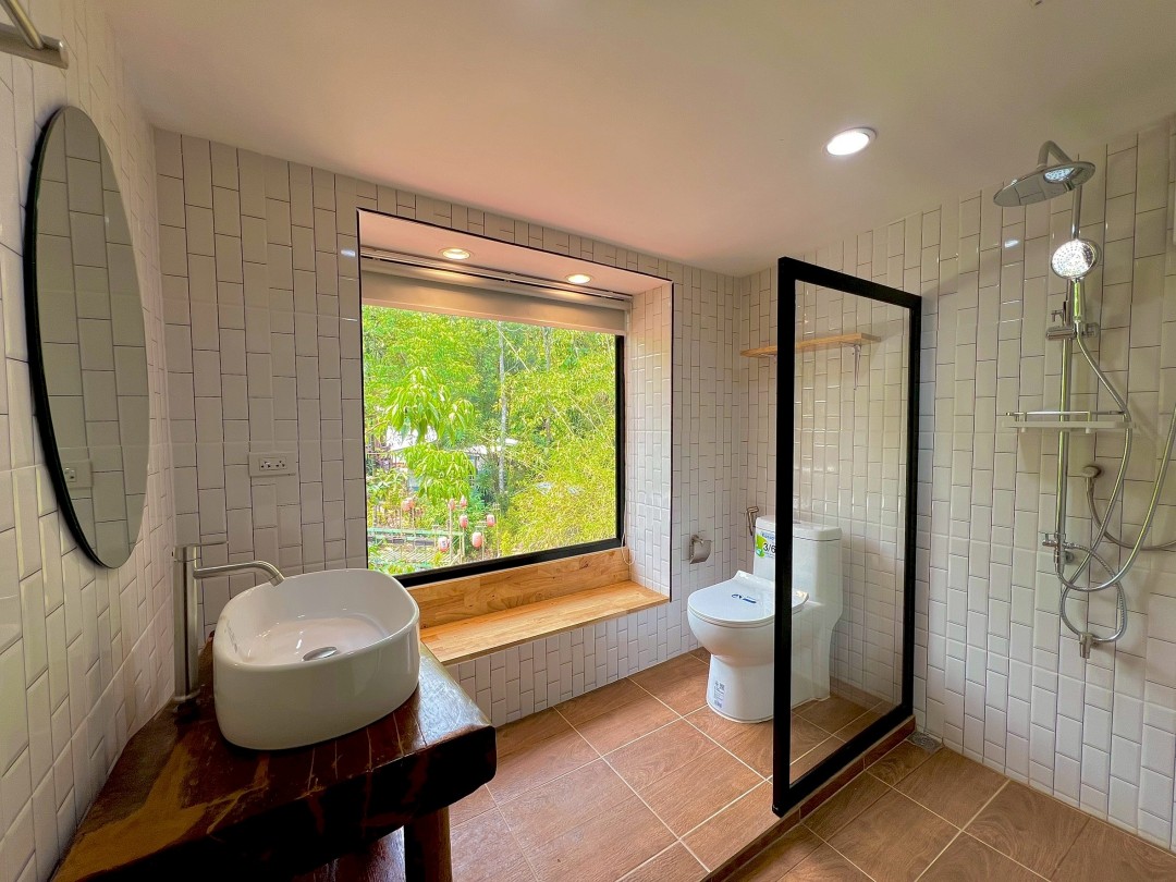 บ้านหลังใหญ่ 2 ชั้นมีห้องพัก 4 ห้องนอนแยกโซนเป็นห้องนอนชั้นบน 2 ห้องมีห้องน้ำในตัวสามารถเห็นวิวลำธาร ชั้นล่าง 2 ห้อง มีห้องน้ำ 4 ห้องอยู่ด้านล่าง ตัวอาคารเป็นห้องน้ำรวม แต่มีสิ่งอำนวยความสะดวกครบครัน ไม่ว่าจะเป็นเครื่องทำน้ำอุ่น ชุดเรนชาวเวอร์ ชักโครกใหญ่ นั่งสบาย โดยเฉพาะคนที่ตัวใหญ่ วิวหน้าห้องพักเป็นวิวลำธาร ชั้นบนมีระเบียงกว้างขวางมากค่ะ