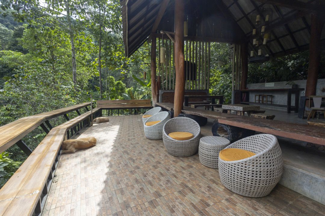 บรรยากาศร้านตกแต่งในโทนสีน้ำตาลอบอุ่นเหมาะสำหรับการนั่งพักผ่อนและจิบกาแฟในบรรยากาศธรรมชาติ