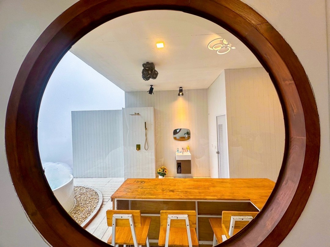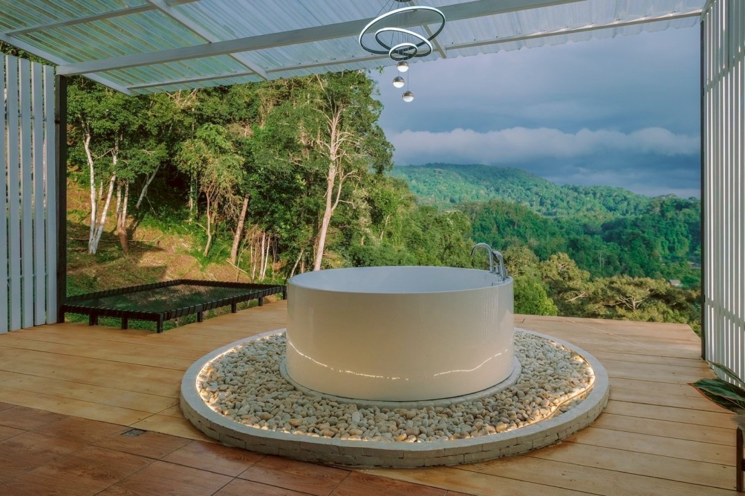 Accommodation options include: private minimalist-style white cottages with jacuzzi tubs and whirlpool systems, modern loft-style houses and luxurious white minimalist dome tents. Rooms with soaking tubs allow guests to fully enjoy the view right from their doorstep. Large glass windows near bed let guests wake up with scenic mountain and mist views without leaving the room.