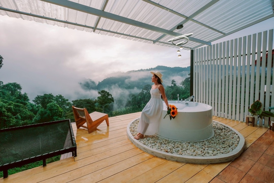 Accommodation options include: private minimalist-style white cottages with jacuzzi tubs and whirlpool systems, modern loft-style houses and luxurious white minimalist dome tents. Rooms with soaking tubs allow guests to fully enjoy the view right from their doorstep. Large glass windows near bed let guests wake up with scenic mountain and mist views without leaving the room.